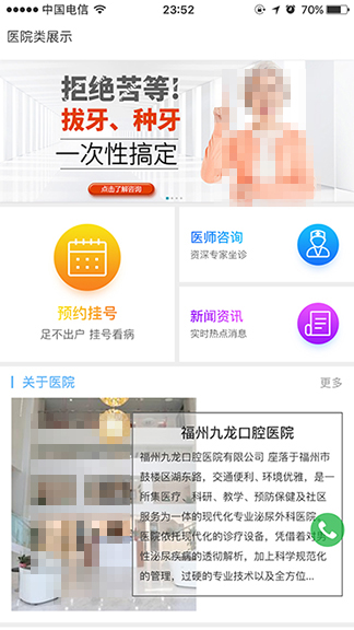 接下来放置部分医院简介、医疗环境图片、资讯中心、联系我们等信息;首页右下侧有一个电话的悬浮按钮,点击可快速联系到医院门诊前台热线;