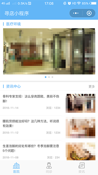 医院类小程序,以展示和预约为主,主要是为了让人了解该医院的一些基本信息,在线咨询医生,在线预约门诊,展示医院地址和联系方式,方便用户更快的到院检查。