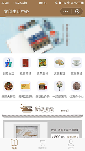 导航栏使用了10个按键,也以文创商品实物图片为样式,加深文创气息;第一行,点击进入相应的分类页;第二行,主要是营销功能,本小程序结合寻店商提供的多种营销工具:例如,新人礼包,幸运大转盘,天天刮刮乐,还有砍价,拼团,优惠券等。