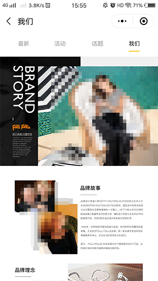 首屏放置促销活动页面,通常用来渲染活动氛围,提高用户的购买欲望;下拉后分最新、活动、话题、我们这个版块,更全面的与用户进行沟通,让用户认识品牌,了解品牌故事;还有新款推荐、专题推荐栏,把更多的好产品展示介绍给用户。
