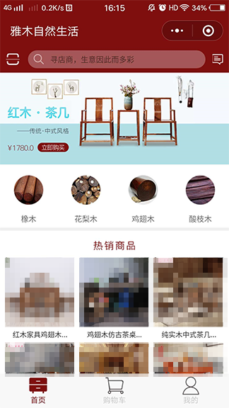 banner位置可放置热销的商品广告图,让用户清楚地了解到相关活动信息,吸引用户点击选购;导航栏的四个按钮对市面上比较普遍存在的红木家具按材料的不同分为四种,用户可根据材料分类快速找到想要的红木类型家具;