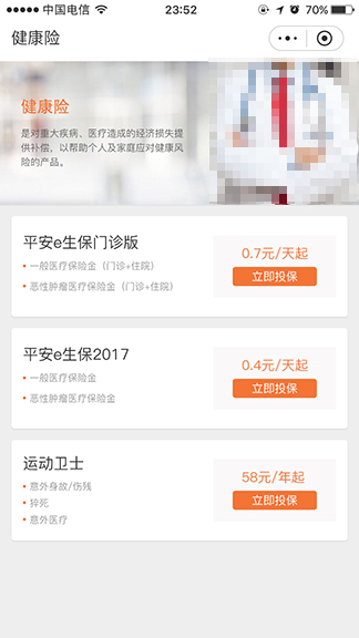 点击首页的保险产品类目进入到相关的页面,页面介绍了该种类下的各种保险产品,点击可进入到保险详情页;